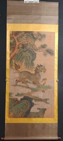 A旧藏纯手绘绢本四尺中堂带提拔ZZ119 郎世宁麒麟图