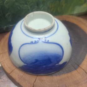 日本购回: 清代或民国时期青花小钵,小碗,茶碗,直径10.5厘米,高5.5厘米,内手写寿字纹,外手绘萝卜图案,青花发色好,老青花,有老铁线冲线,底足小磕碰。