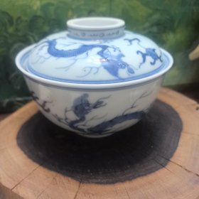 日本购回: 清代或民国时期青花龙纹盖碗,青花手绘四爪二龙戏珠,两条龙形态各异,栩栩如生,张牙舞爪,青花发色纯正,老青花,有小磕碰老铁线冲线和修复痕迹,盖子和底部有款识。百年柴烧老青花,不能正常使用,可做茶道标本,茶室文房摆件,喜欢不要错过。