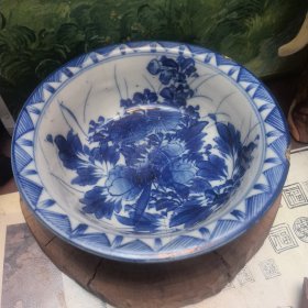 日本购回: 清代或民国时期青花大钵大碗,茶道杯洗,建水,直径16.5厘米,高6厘米,手绘满绘花卉图案,青花发色好,百年老青花,玉璧底,开门老包浆厚重,口沿有两处修补痕迹 ,残器,有老铁线冲线。