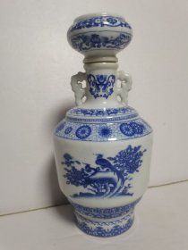二斤装小鸟牡丹花图双耳青花瓷酒瓶