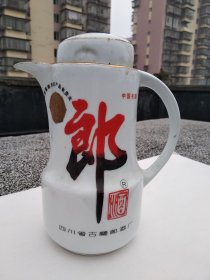 馆藏级别,目前市面上没有出现第二件:中国名酒郎酒壶一只,带原盖子。荣获国家优质产品金质奖,四川省古蔺郎酒厂留念“美酒待客客自留,佳酿迎宾宾不归,一九八七年春”