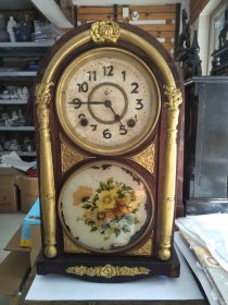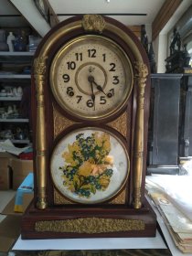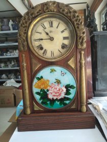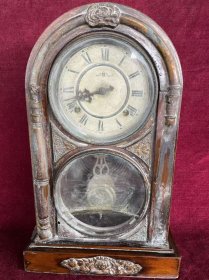 上海老式座钟:整体自然陈旧氧化基本完整、木质外壳搭配白色表盘,阿拉伯数字时标,正常工作、长49高24.5宽13.5厘米、玻璃罩有一线不到头、木雕缺失一点、需要的直接拍!