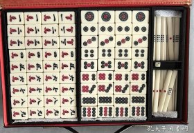 竹背老麻将一副,144张标准牌数,牌面清晰,字迹工整。配有原装骰子和点棒,尺寸约2.5x1.8cm。黑色皮质外盒,带提手设计,保存完好。适合收藏、朋友聚会使用。实物拍摄,成色如图。