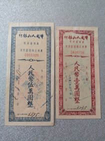 1952年中国人民银行广西省分行定额储蓄存单2张(伍万圆壹万圆各一张)