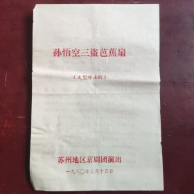 1980年苏州地区京剧团演出大型神话剧孙悟空三盗芭蕉扇节目单