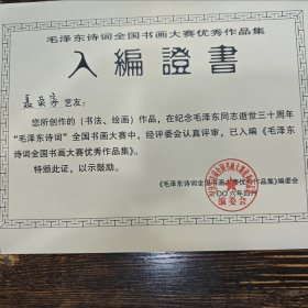 入编证书。聂英家艺友您创作的书画作品在纪念毛泽东同志逝世30周年。橘子洲杯。全国书法大赛中以入编大赛优秀作品集,当代中国书画名人作品鉴赏。