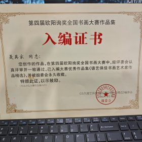 入编证书,聂英家艺友。您创作的书法作品。在第二届欧阳询奖,全国书法大赛中巳入编大赛优秀作品集。中国当代知名书法家墨迹选。