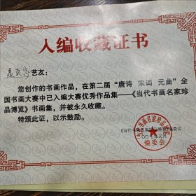 入编收藏证书。在第二届唐诗,宋词,元曲全国书画大赛中入编大赛作品集当代书画名家。珍品博览,书画集。并被永久收藏。