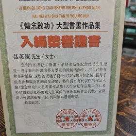 入编荣誉证书。聂英家先生。您创作的书法,绘画将作为富有代表性的作品入编怀念启功大型书画作品集。