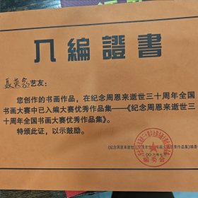 入编证书。聂英家艺友您创作的书画作品,在纪念周恩来逝世三十周年全国书画大赛中。已入编大赛优秀作品集。