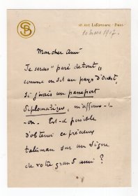世界顶级画家 点彩之父 新印象派与点彩派创始人之一 保罗·西涅克(Paul Signac)1907年亲笔信 有关申请一张外交护照事宜 书于私人定制信纸上