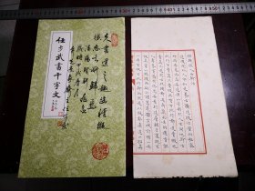 任步武书千字文(任步武签名钤印赠送本封面毛笔题35字另附一页墨迹《绘图金莲传》用荣宝斋玉版笺宣毛笔书写约三百多字)任步武1933年 -2023年5月2日字奔先,号意象斋主陕西大荔人。45岁始拜李子青、王济先生为师,后复拜文怀沙、刘自椟、锺明善名家发奋学书书艺大进成绩斐然。为中国书法家协会会员,中国书法家协会书法培训中心教授,中国诗书画研究院研究员,香港国际美术学院客座教授,苏州大学艺术学院客座教授