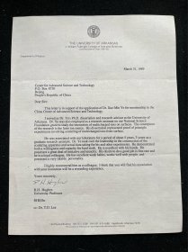 物理学者 - 天津大学李希曾、竺可桢外孙女浙江大学的姚竺绍、阿肯色大学教授,F.T. Chan陈教授推荐叶学敏博士申请加入贵中心等人信件资料3页