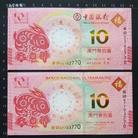 澳门钱币 2023年生肖兔纪念钞一对2张纸币 尾数三同号