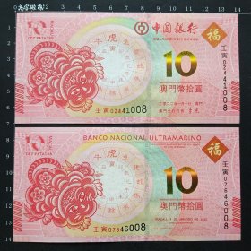 澳门钱币 2022年生肖虎纪念钞一对2张纸币 尾数三同号