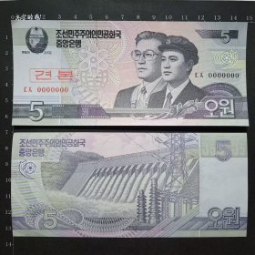 朝鲜钱币 5元纸币 2002年 样票 (号码都是0)