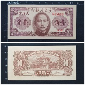 广东省银行 大洋票 壹角/1角纸币1张 民国三十八年钱币 (微黄)