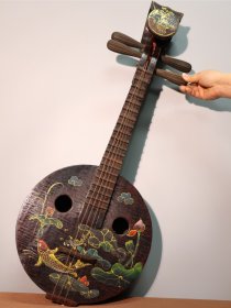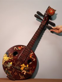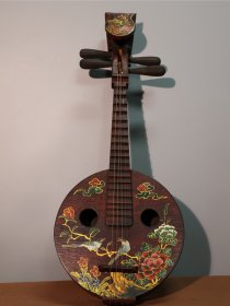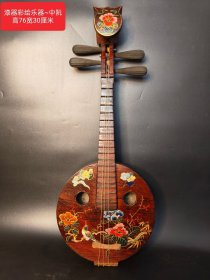 漆器彩绘乐器~中阮 高76厘米宽30厘米 中阮是中国传统弹拨弦鸣乐器,属于阮咸类乐器 。琴头装饰有花卉图案,琴身圆形面板上绘有花鸟、祥云等传统图案,色彩绚丽,工艺精美,既可用作演奏民族音乐,也具有较高的艺术观赏价值,常出现在民族器乐合奏等音乐表演场合…………