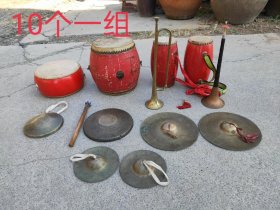 乡下收来锣鼓一套10件,4个鼓2个锣2个嚓,一个唢呐,一个号,两对咣咣叉。完整可用,尺寸细节如图,