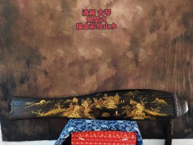 《清籁》古琴 鱼型 彩绘描金山水 此琴为桐木斫成,通体髹黑漆洒金彩绘描金,鹿角灰胎。池、沼长方形,金徽,檀木轸足,紫檀岳尾。 琴底龙池上方刻填青篆书“清籁”琴名,其下填朱“乾隆御赏”方印。池左右直抵双足刻梁诗正、励宗万、陈邦彦、董邦达、汪由敦、张若霭、裘曰修琴铭,填以五色,七人俱乾隆朝词臣。