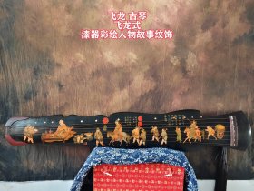 【飞龙】飞龙式古琴 檀木轸足 黑古漆鹿角灰胎 漆器彩绘人物故事纹饰。“飞龙”琴由平江人氏贯道子沈潜所斫,左填行书落款“翀壶子江一圭跋,贯道子沈潜篆”。龙池下方还有大红篆印“平江贯道子整”、“翀壶子藏”。