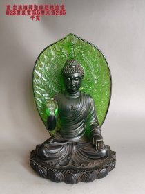 老琉璃释迦摩尼佛造像,翠绿莹润,工艺精湛。佛陀面容安详,姿态庄严,背后饰纹精美,尽显神圣肃穆