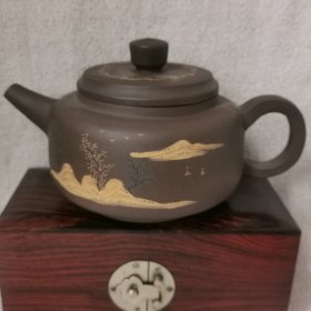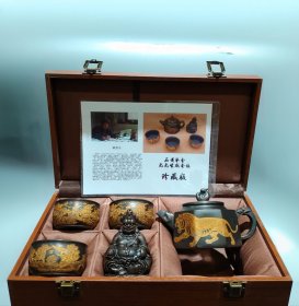 珍藏品名:鎏金虎虎生威套壶 低款:顾景舟 尺寸:14/9cm.. 容量:320cc 泥料:原矿石黄