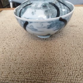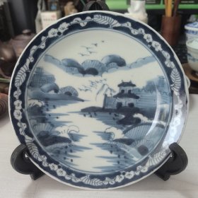 日本购回:老青花手绘山水赏盘,茶道壶承,底部贞字款,直径18cm,高3cm,手绘山水人物,画面细腻,瓷质细腻,釉色漂亮。适合收藏或做茶托、果盘,全新全品,青花发色纯正,釉色油润,喜欢不要错过。