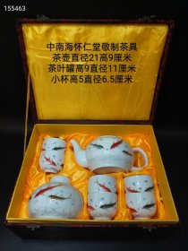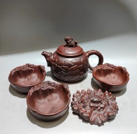 珍藏品名:浮雕山水套壶 低款:顾景舟 尺寸:壶 18/12cm 杯 10/4cm 茶宠 10/3cm 容量:400cc 泥料:原矿古红泥