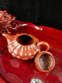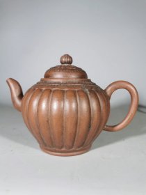 古玩旧藏菊瓣紫砂壶 全手工拉坯雕刻,壶身24瓣菊瓣纹,工艺精细,底部有款识。壶嘴出水顺畅,密封性好,容量约800ml。