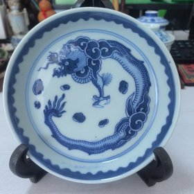 日本购回:清代或民国时期青花赏盘,茶道壶承,文房笔洗。口径15.5,高3cm,手绘鱼化龙纹饰,三爪龙,团龙,底部福字款,画面细腻,瓷质细腻,釉色漂亮。适合收藏或做茶托、果盘,全新全品,非常难得,喜欢不要错过。