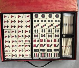 竹背老麻将一副,144张标准牌数,牌面清晰,字迹工整。配有原装骰子和点棒,尺寸约2.5x1.8cm。黑色皮质外盒,带提手设计,保存完好。适合收藏、朋友聚会使用。实物拍摄,成色如图。