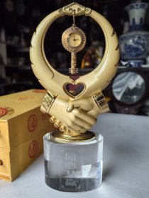 腾达同心共赢摆件,金属镀金握手造型,水晶底座,顶部挂钥匙形小钟,底座刻“同心共赢”字样,做工精致,带原包装盒和合格证,少许轻微氧化,整体不错,高约23,宽11厘米,重930克(不含包装盒)可收藏、办公室、家里摆放等。