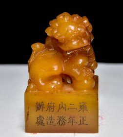 77_旧藏老货 寿山石田黄石印章 石质通透坚硬 雕工精湛 萝卜丝纹清晰可见 包浆醇厚 雍正二年内務府造辦處監製 尺寸:5*5*8厘米(硬) 重量:382克