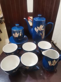 中国烟台底款 蓝釉描金兰花茶具,1壶,5碟5杯,1糖罐+1公道杯,都全品无磕碰。