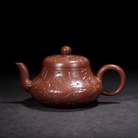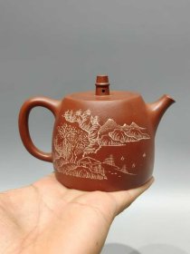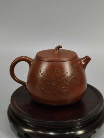 181_老珍藏,《中国宜兴》底款,盖款[红华],刻绘老紫砂壶一把,保存完整,收藏的佳品。
