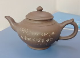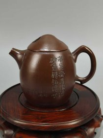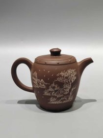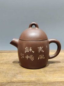 85_老珍藏,《中国宜兴》底款,盖款[海庚],刻绘老紫砂壶一把,保存完整,收藏的佳品。