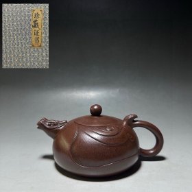 精品珍藏证书紫砂壶 品茗:龙龟 底款:顾景舟 材质:紫砂 容量:450cc 出水孔:网孔 尺寸: 17.5/8cm 底款介绍:顾景舟(1915-1996),原名景洲。别称:曼希、瘦萍、武陵逸人、荆南山樵。自号壶叟、老萍。宜兴紫砂名艺人,中国美术家协会会员,中国工艺美术大师。18岁拜名师学艺。三十年代后期至上海制壶仿古。1954年进入宜兴蜀山陶业合作社。