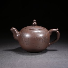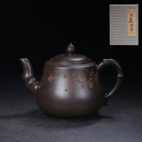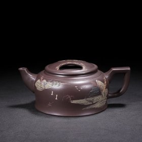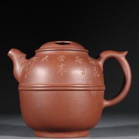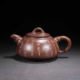 诗文刻绘腰线紫砂壶 款识:中国宜兴 咸仲英 近现代 高 12×15.5cm容量约350cc