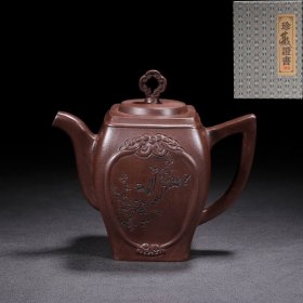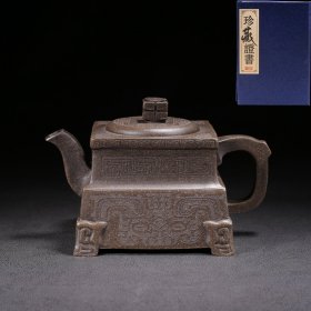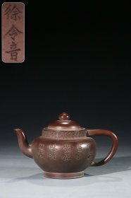 【古珍玩藏】·【历代壶艺】 【回纹刻绘宫灯】【徐令音】 【尺寸】长18.2cm,11.5宽cm,高10.8cm 【简述】徐令音,江苏宜兴人。善制紫砂壶,疑即世所称(士衡子)。《宜兴县志、中国艺术家征略》。