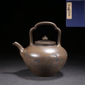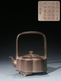 【古珍玩藏】.【历代壶艺】 【徐令音】款提梁壶 【尺寸】长13.8cm,10.6宽cm,高15cm 【简述】徐令音,江苏宜兴人。善制紫砂壶,疑即世所称(士衡子)。《宜兴县志、中国艺术家征略》。