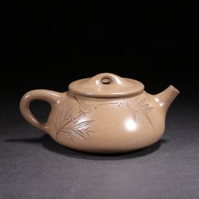 品名:【竹韵】紫砂壶 底款:顾景舟 尺寸:17/9cm 容量:450cc 紫砂分类:原矿紫泥 底款介绍:顾景舟(1915年一1996年),原名景洲,后改名为景舟。别称曼希、瘦萍、武陵逸人、荆南山樵,自号壶叟、老萍,中国工艺美术大师、宜兴紫砂名艺人、中国美术家协会会员。顾景舟曾自创堂号为自怡轩。他在壶艺上的成就极高,技巧精湛,且取材甚广。可说是近代陶艺家中最有成就的一位,所享的声誉可媲美明代的时大彬