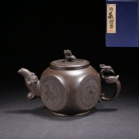 品名:【龙凤呈祥】紫砂壶 底款:武陵艺人 盖款:顾景洲 尺寸:17/8cm 容量:350cc 紫砂分类:原矿古铜泥 底款介绍:顾景舟(1915年一1996年),原名景洲,后改名为景舟。别称曼希、瘦萍、武陵逸人、荆南山樵,自号壶叟、老萍,中国工艺美术大师、宜兴紫砂名艺人、中国美术家协会会员。顾景舟曾自创堂号为自怡轩。他在壶艺上的成就极高,技巧精湛,且取材甚广。