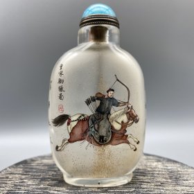 本店旧藏 老琉璃 手工绘画 【皇家御猎图】人物诗文内画鼻烟壶 【拍品介绍】宝贝图案清晰明了,画面形象生动,惟妙惟肖,器形完整,美观大方,古朴典雅,包浆细腻,古香古色,老气横秋,实属收藏爱好者修身养性,补充涵养的佳品!!! 鼻烟壶是地道的国粹!中国工匠的才艺便在其中发挥得淋漓尽致,现已成为艺术品收藏和投资的热门。具有较高的收藏价值和艺术欣赏价值!