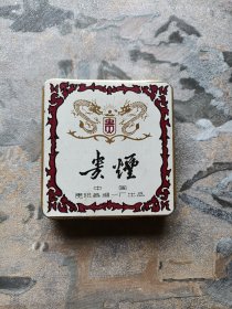 贵烟铁制烟盒,只是烟盒请看好。中国贵阳卷烟厂出品,盒身有双龙戏珠图案,红色边框装饰精美,中间有"贵"字标志。盒子整体呈银白色,边缘有龙纹点缀,新旧程度如图所示。