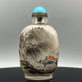 本店旧藏 琉璃内画鼻烟壶【真风牧童】山水内画鼻烟壶 尺寸:宽5.2x厚2.8x高9厘米 重量:66克 【拍品介绍】宝贝图案清晰明了,画面形象生动,惟妙惟肖,器形完整,美观大方,古朴典雅,包浆细腻,古香古色,老气横秋,实属收藏爱好者修身养性,补充涵养的佳品!!! 鼻烟壶是地道的国粹!中国工匠的才艺便在其中发挥得淋漓尽致,现已成为艺术品收藏和投资的热门。具有较高的收藏价值和艺术欣赏价值!