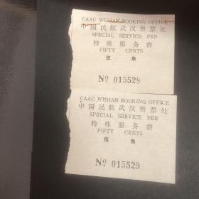 早期中国民航武汉售票处特殊服务费伍角连号2张(民航发票)