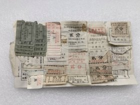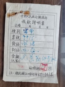 故纸堆2377 新中国初期火车票 中央人民政府铁道部收款证明书 宝鸡--西安 旧币24100元 手工刻印票据