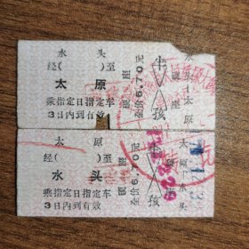 硬卡火车票•太原 至 水头、水头 至 太原•全价6.7元•两张(中国铁路车站:水头站位于山西省运城市夏县水头镇,于1935年投用。车站隶属太原铁路局侯马车务段管辖,现为四等站,距太原站385公里。)